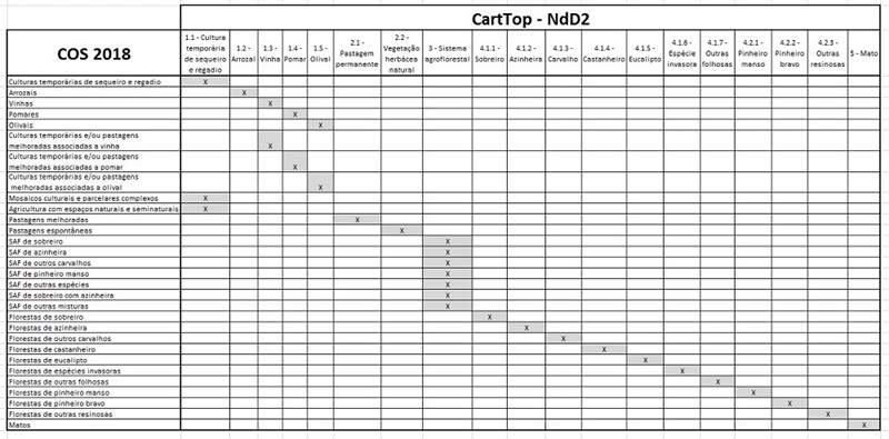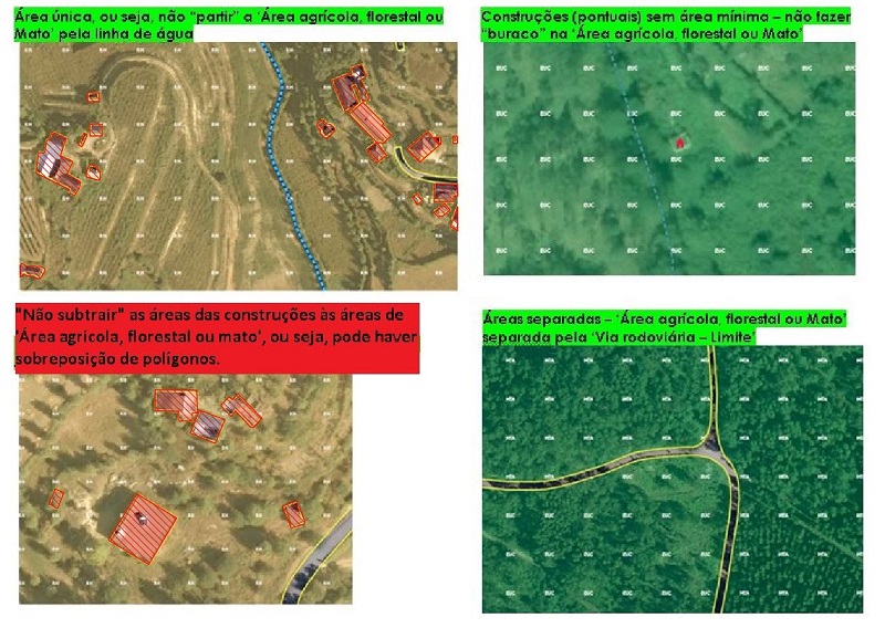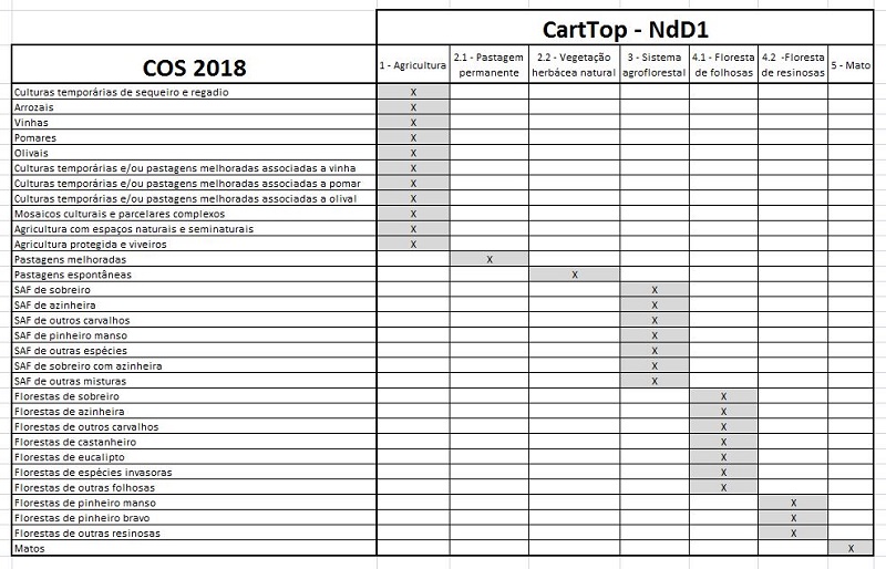 A elaboração da cartografia topográfica pode recorrer aos dados da Carta de Ocupação do Solo (COS). A COS pode ser utilizada como fonte de dados auxiliar, utilizando para este efeito a relação entre as classes da COS e os valores dos atributos previstos para o NdD1 e NdD2 (ver esquemas de mapeamento). No entanto, importa ter em consideração que a área mínima cartografada na COS é de 10 000 m2 e as áreas mínimas que exigem representação na cartografia topográfica são de 2000 m2 e 5000 m2 para o NdD1 e NdD2, respetivamente. Assim, a informação da COS deve ser objeto de interpretação e de ajustamentos em função das áreas mínimas descritas, tendo ainda em consideração todas as demais regras específicas definidas para o tema “Ocupação do Solo”.